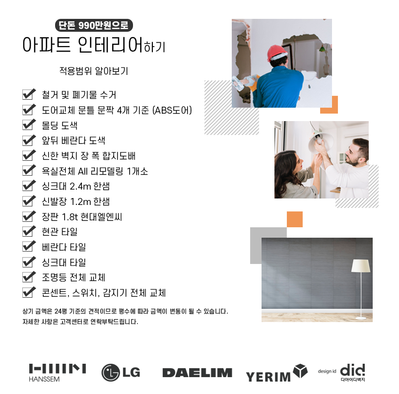 고객 사은의 의미로 단 990만원으로 아파트를 리모델링 할 수 있는 이벤트를 준비하였습니다.적용되는 항목을 꼼꼼히 따져보시고 적은 비용으로 고급스러운 인테리어를 완성해보시기 바랍니다!